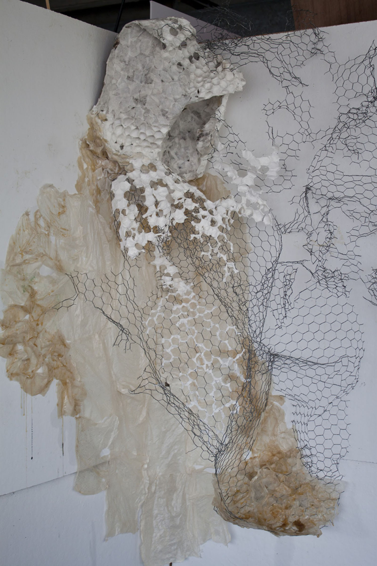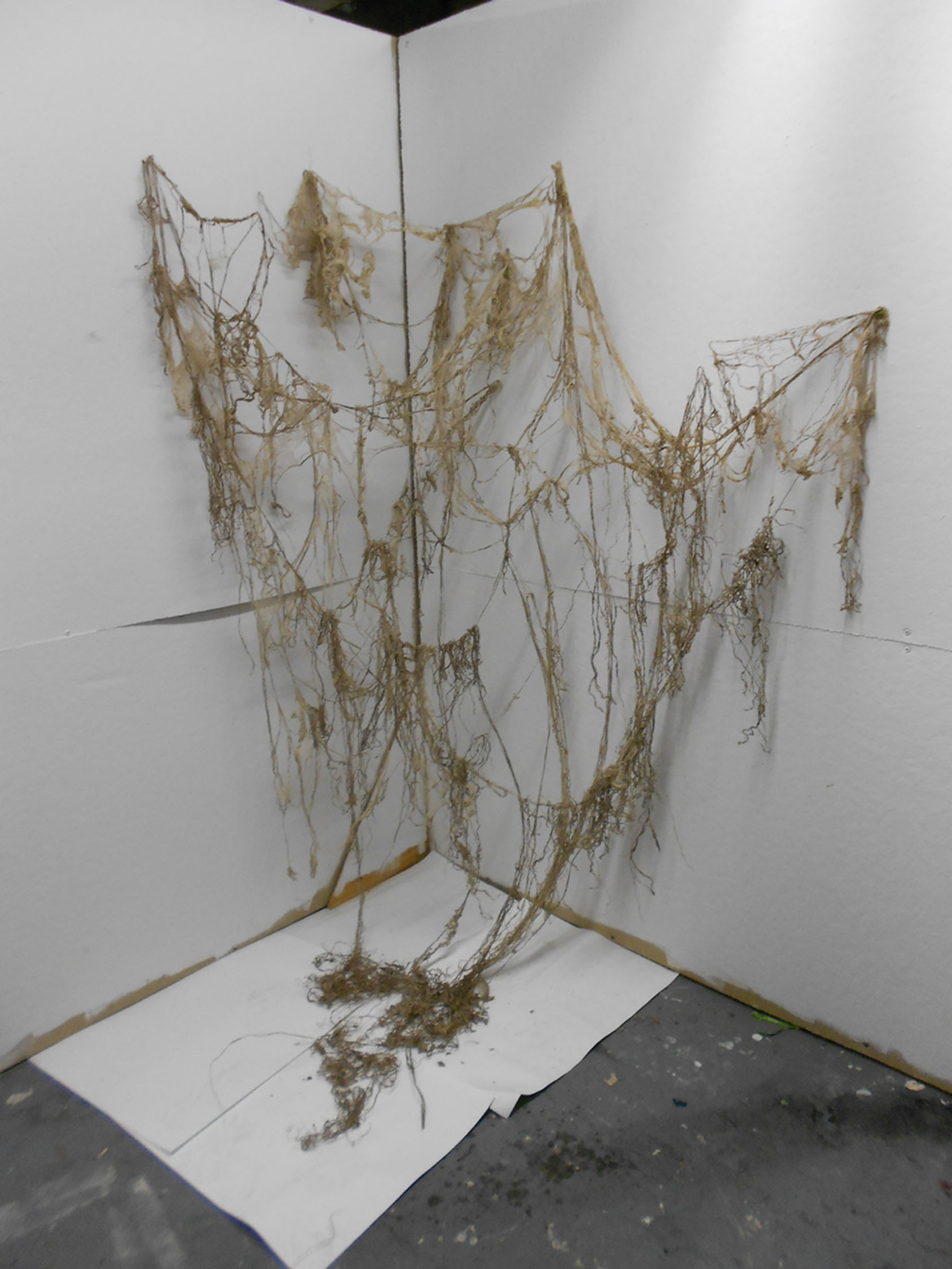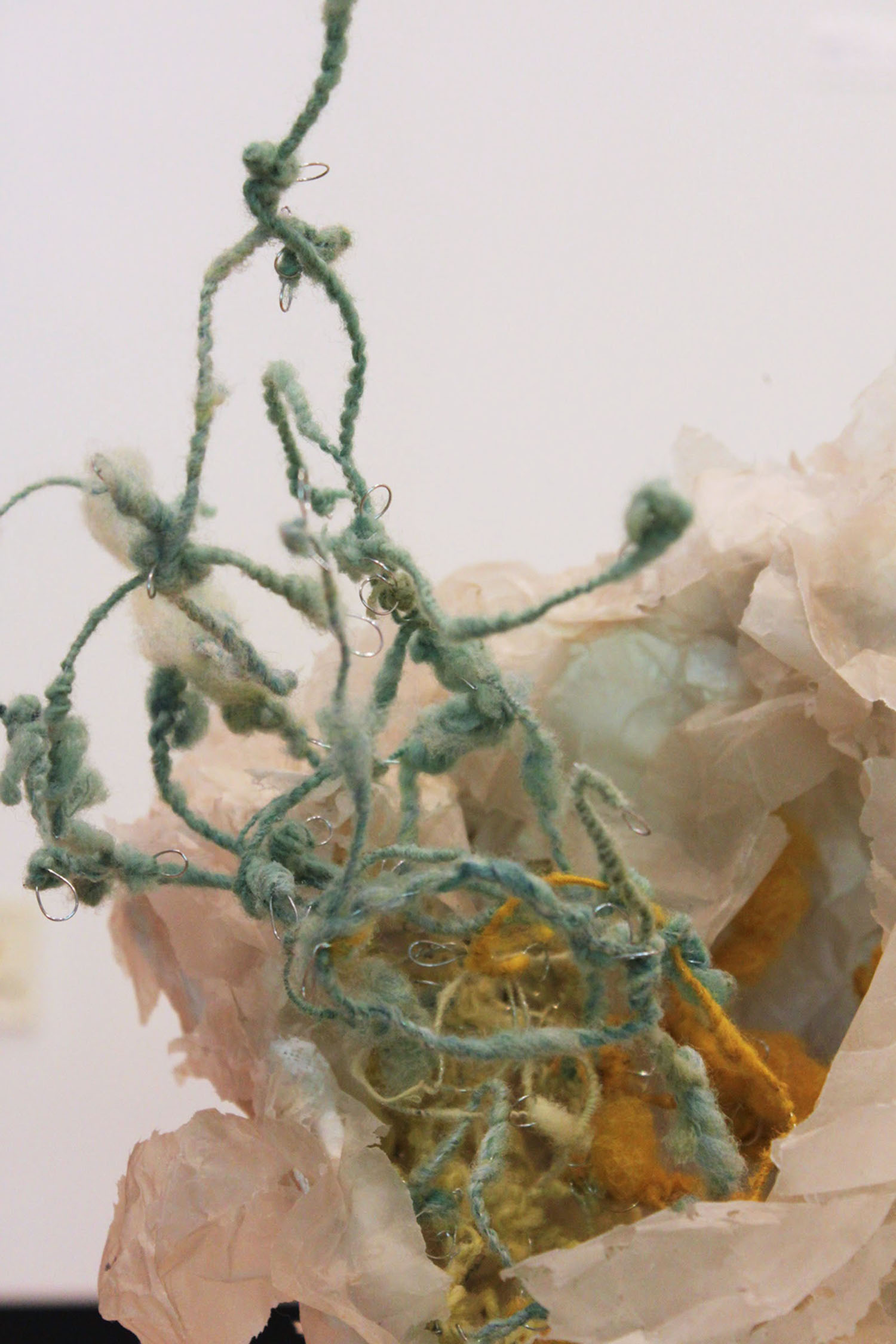 | dc.description.abstract | As an artist, I am inspired by natural processes and forms, but do not explore them in a scientific way. Instead of creating representations of them, my work remains abstract, I work intuitively, and the images ultimately come from my own imagination. Natural systems such as tissues develop from individual units that multiply into more complex structures. As these replications grow, mutations occur, disrupting the process leading to unpredictable results. The repetitions and mutations eventually create complex patterns and forms that we can see. However, the internal units and processes that form the external bodies remain invisible to the naked eye. My work consists of drawings, sculptures, and installations that have both two-dimensional and three-dimensional qualities. In order to create the feeling of a natural system I work very repetitively, always building off of small units. The work draws attention to the mutations that come about through repetition. While I started just focusing on natural growth, creating mutations by changing the patterns in my drawings, as I began to work more dimensionally the mutations came about through how I altered the form of the materials. I began to use processed materials made by a manufacturer or processed myself. The materials I make include: handmade paper, paper pulp, cooked kozo (paper mulberry bark), cranberry sauce, and spun wool. The industrial materials include: plaster cloth, chicken wire, wire, honey, corn oil, pencil, pen, and ink. Combining materials, such as hand-spun yarn with manufactured wire or honey with dried handmade paper, formed contradictions that came to represent the mutations. These contrasting materials created tension in the work through oppositions that included: order versus chaos, growth versus decay, outside versus inside, small versus large, soft versus hard, and wet versus dry. However, my work at the same time strives to achieve a balance between these conflicting forces. While there is a focus on the internal structures that create organisms, the sculptures as a whole form into individual complex organic bodies. The work gives off an ephemeral, weightless, but also growth-like quality to mimic the feeling of something living. Recent installations have illuminated an emotional charge that results from the realization that, while organisms live and grow they eventually decay and die. | en_US |