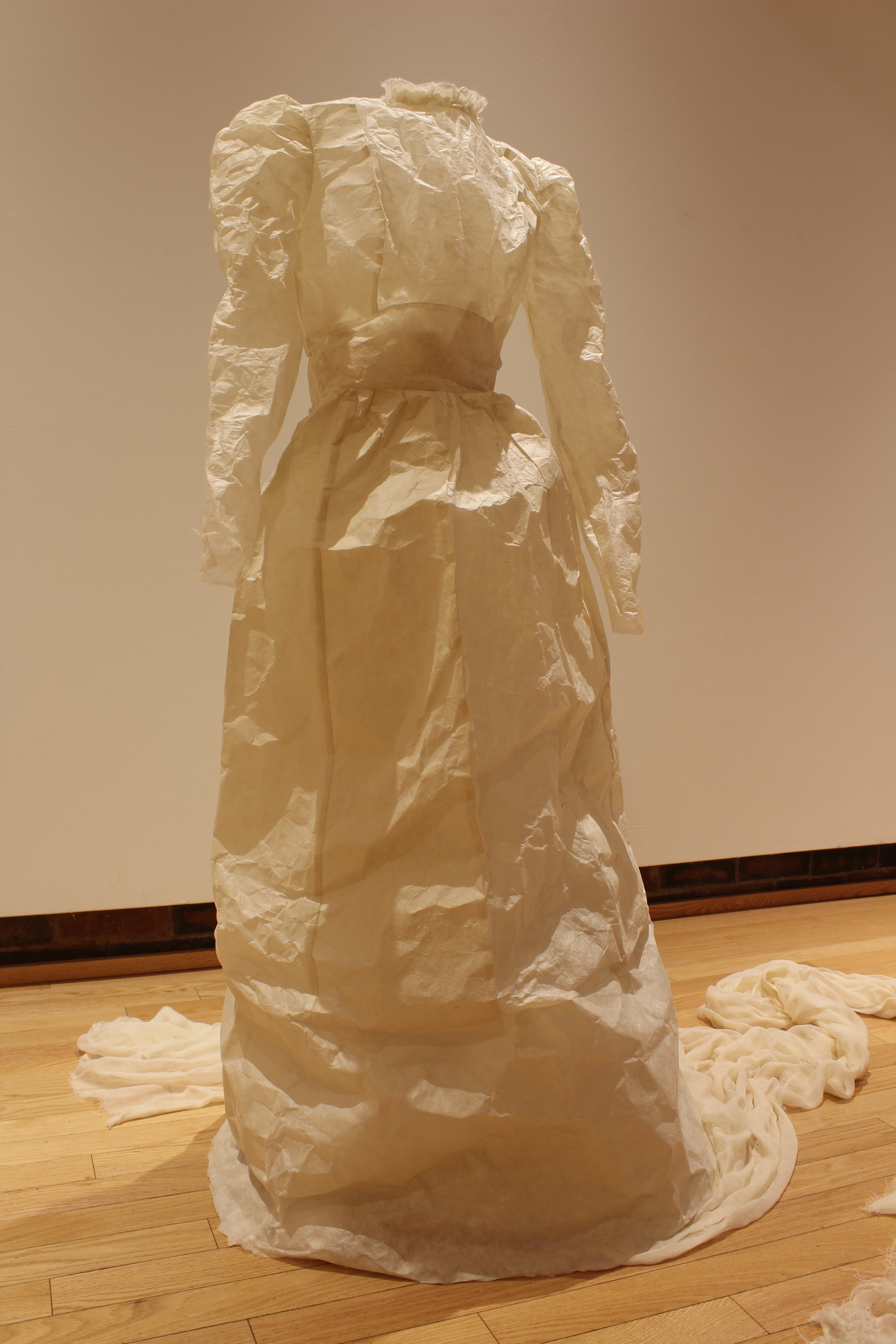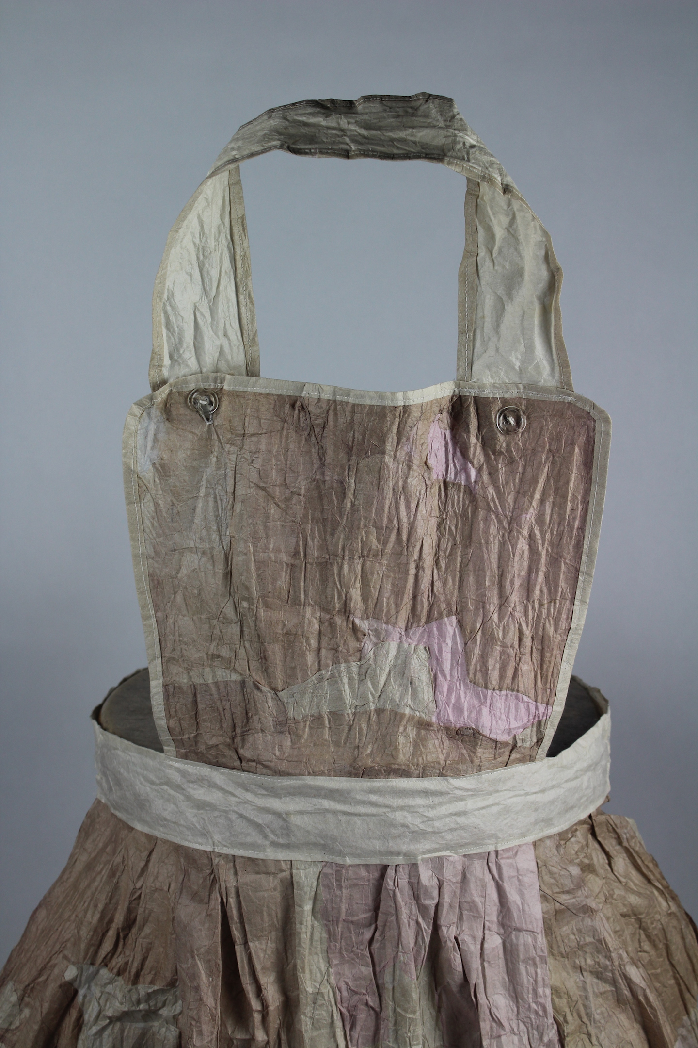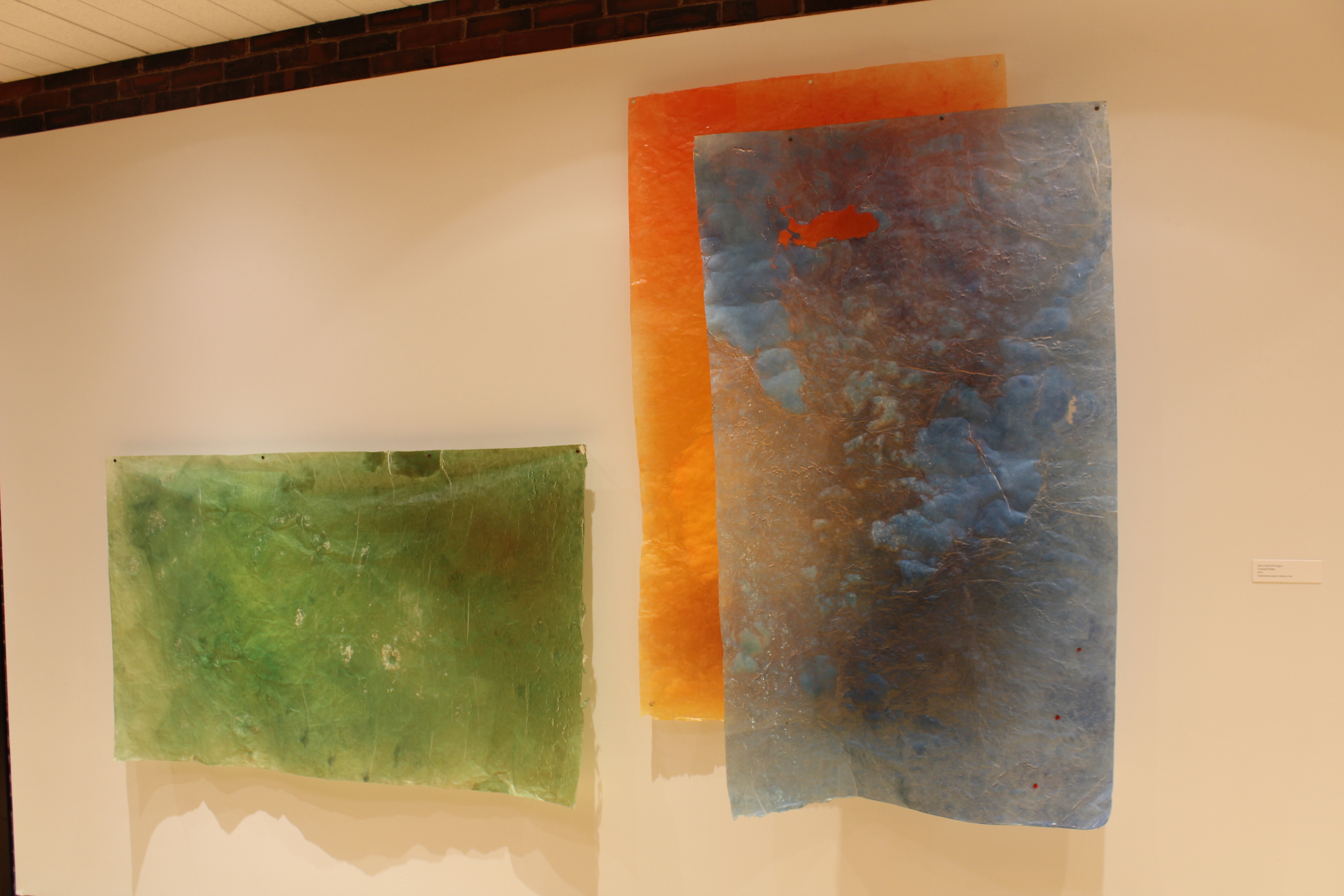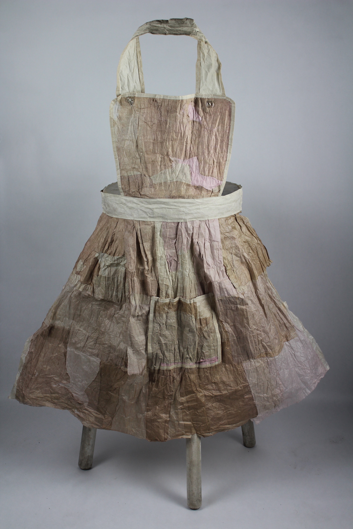 My art installations explore women’s traditional work. The process of making handmade paper mimics the often tedious, mundane, and oppressive aspects of domestic chores like doing laundry or dishes. The soaking, beating, rinsing, and pressing of fiber into sheets of paper is labor intensive. The paper with its imperfections is used to create simple objects of domesticity like an apron or laundry basket or large panels of color that focus on process. This work has helped me to reconcile with the past twenty-five years as a mother. Art making creates a foundation from which to understand and reclaim oneself.