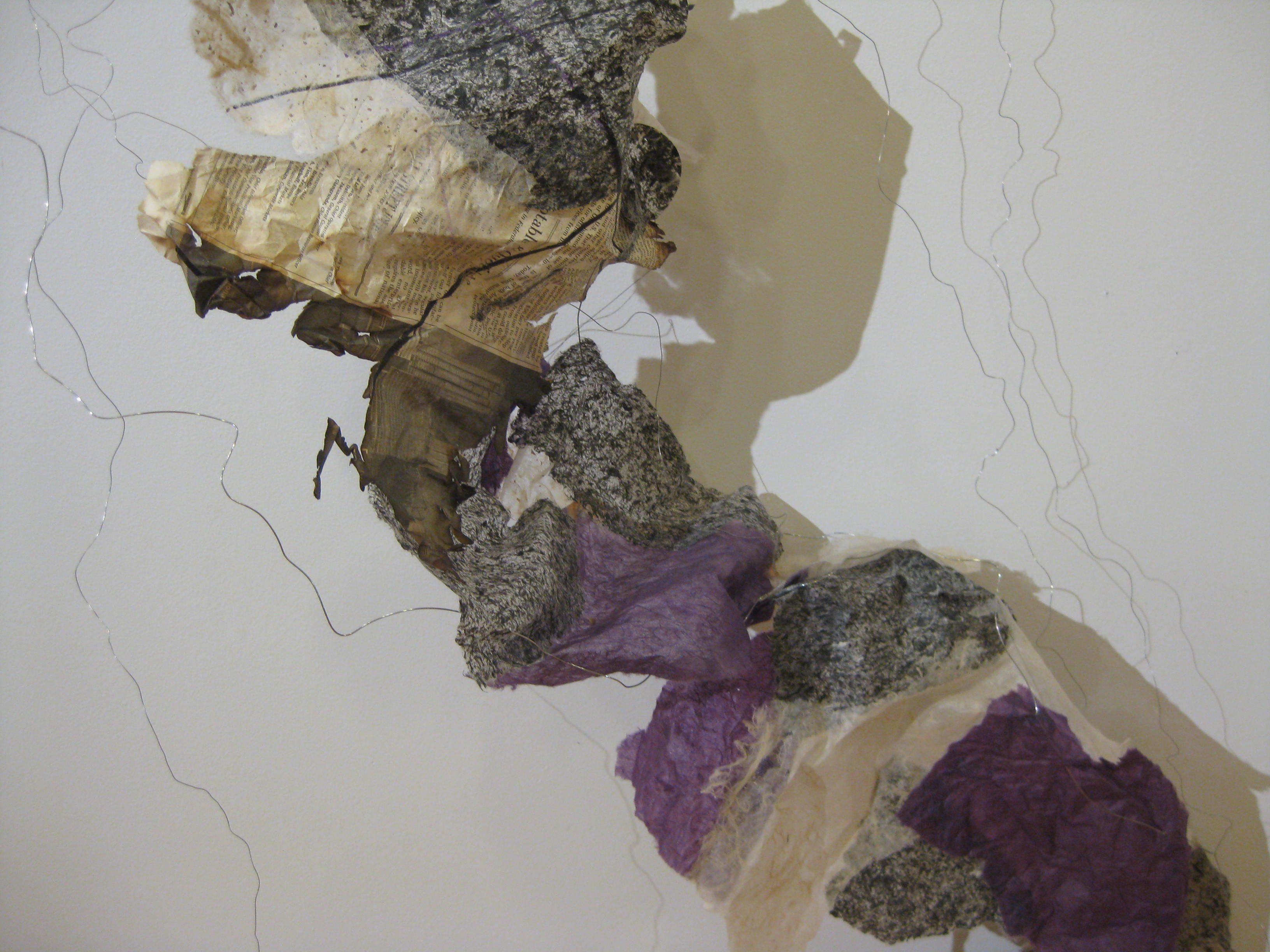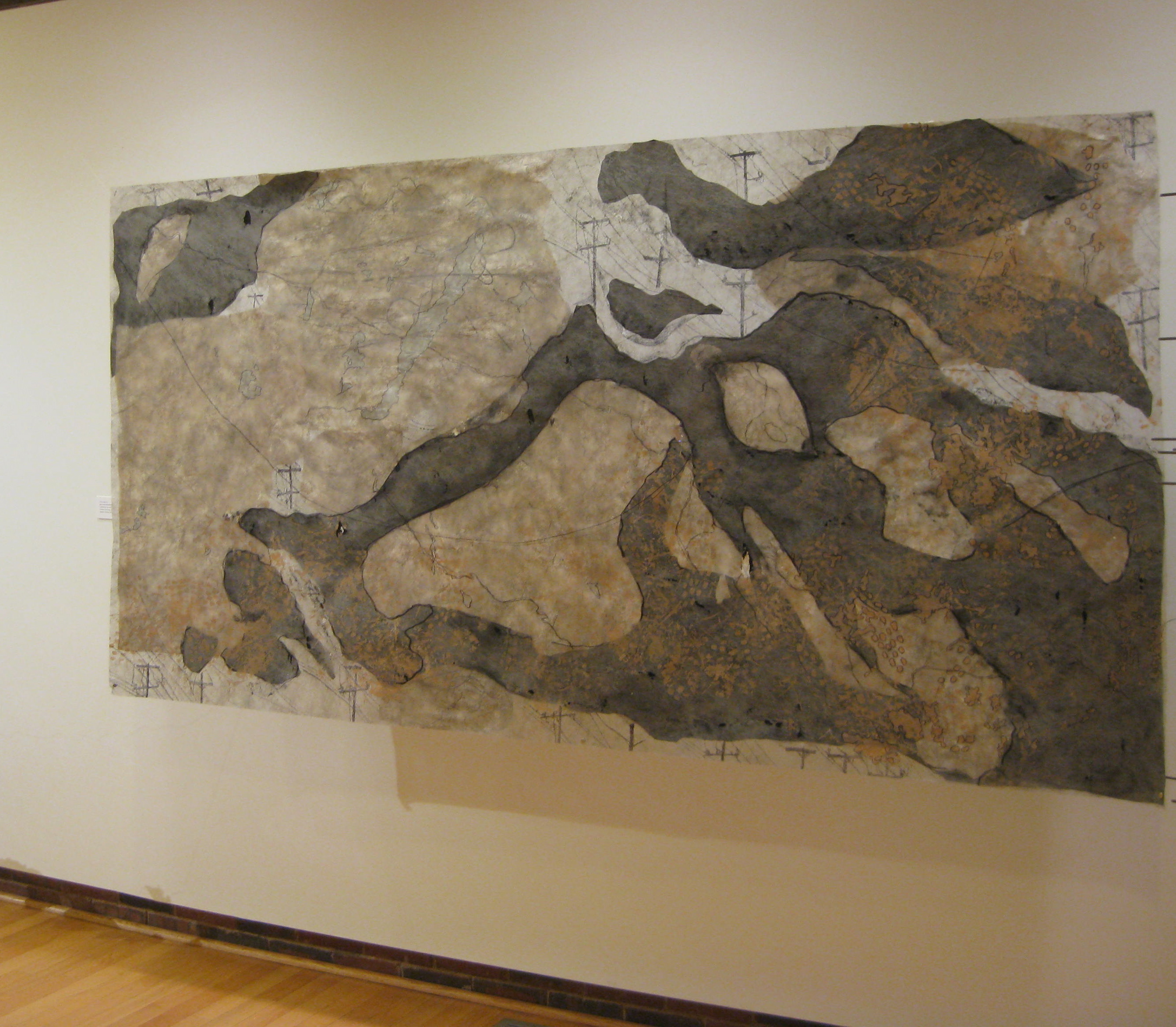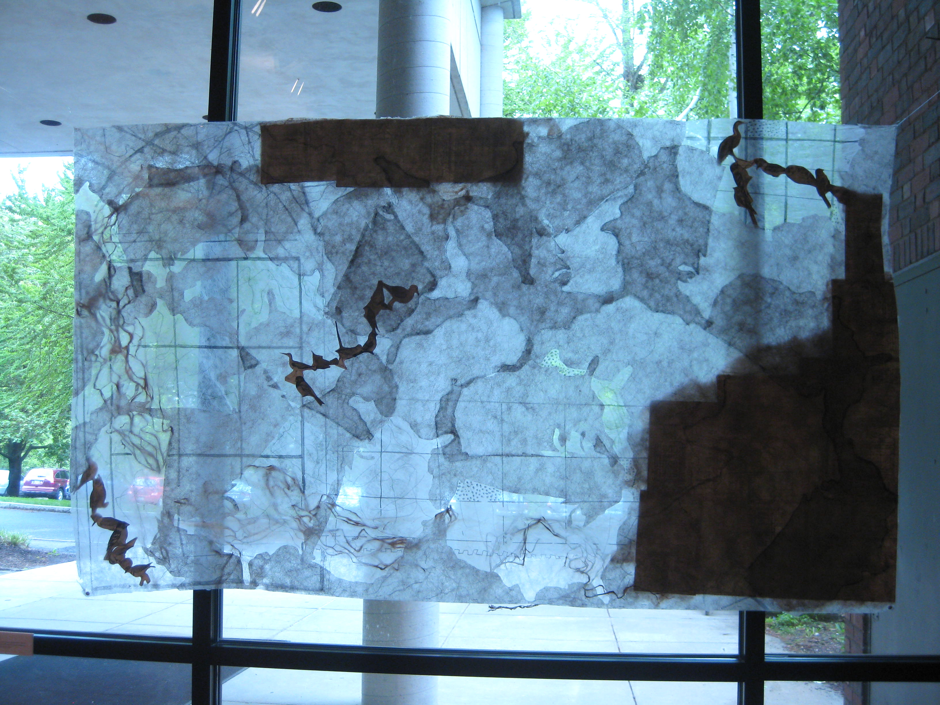 I visually explore landscape as inspired by looking through the lens of sustainability. This exploration considers a landscape in terms of systems and substances. Through papermaking, printmaking, mixed media assemblage and collage, drawing, and burning, layered images draw on multiple places and perspectives. The pieces represent “landscape” as the spatial entity of area that integrates the environment, living systems, and the human-made.