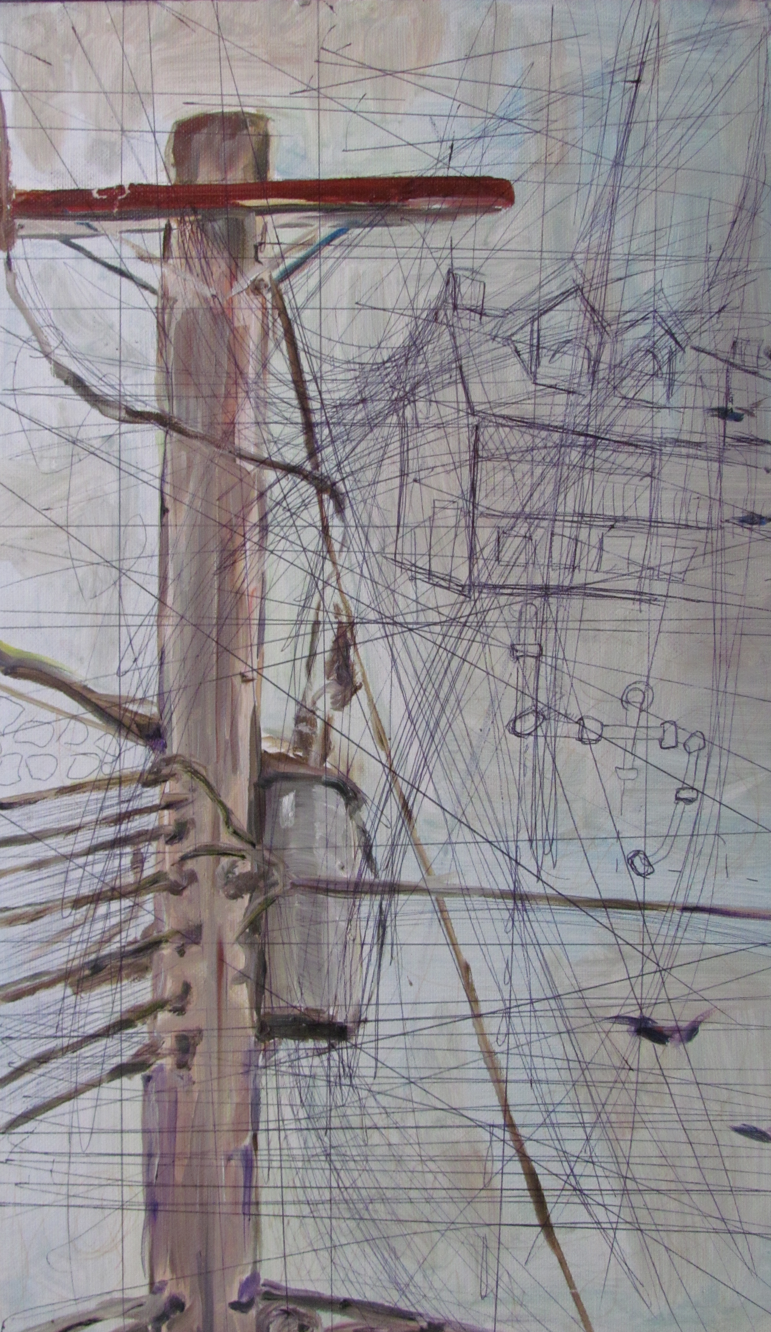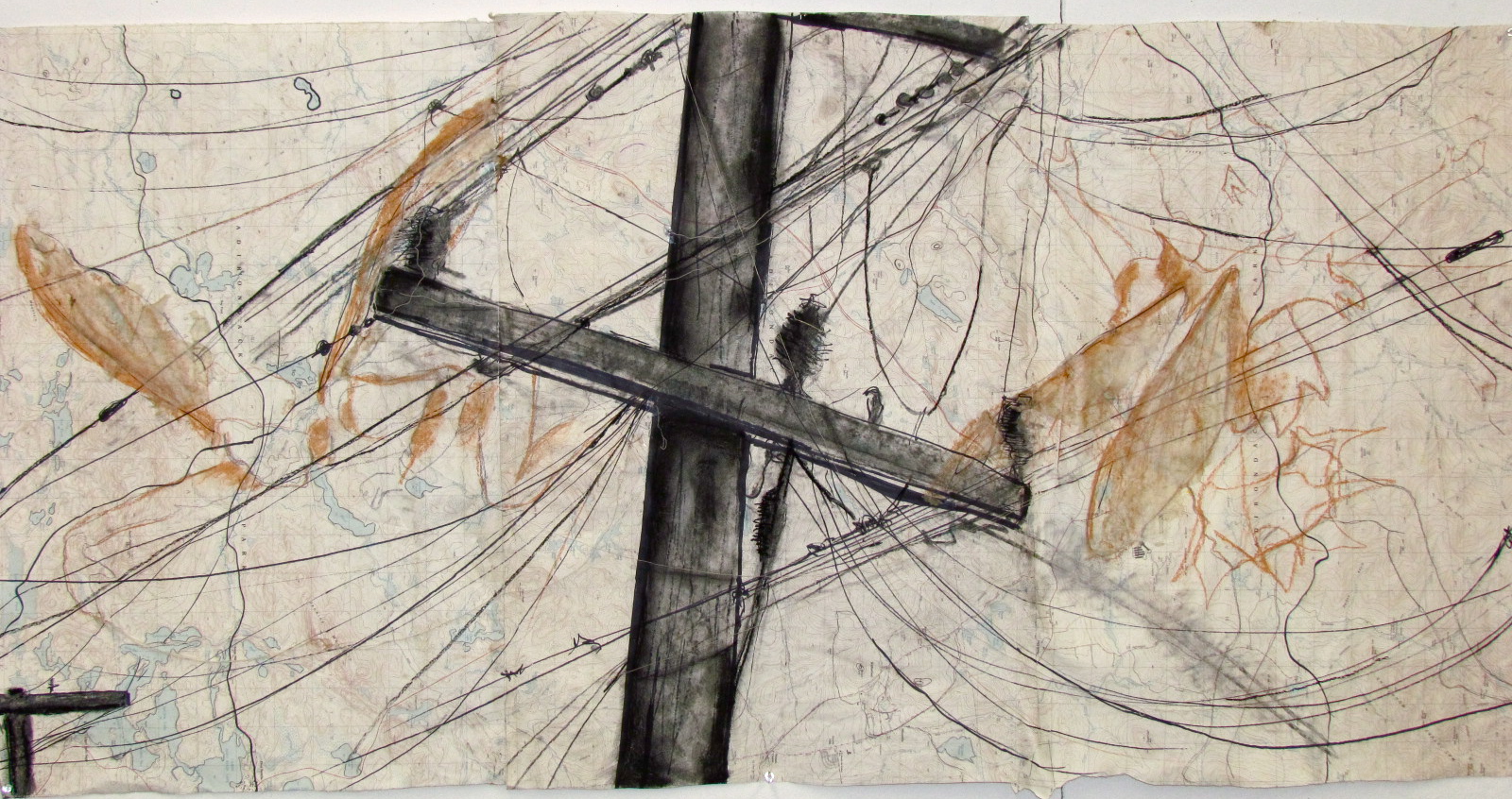 Space is a web of interconnectedness; matter, energy, and patterns combine into networks of infrastructure in the form of roads, electrical currents, sewage pipes, pathways, internet, and ecosystems. Climatic changes are altering the world, and the identity of places is shifting. Artistic actions are captured through regenerative combinations, movements, lines, and planes. I carve away at surfaces, reshaping and determining form and distance. Drawn and sewn ectors articulate the way mass moves through an area, forming linear and non-linear pathways and connections.