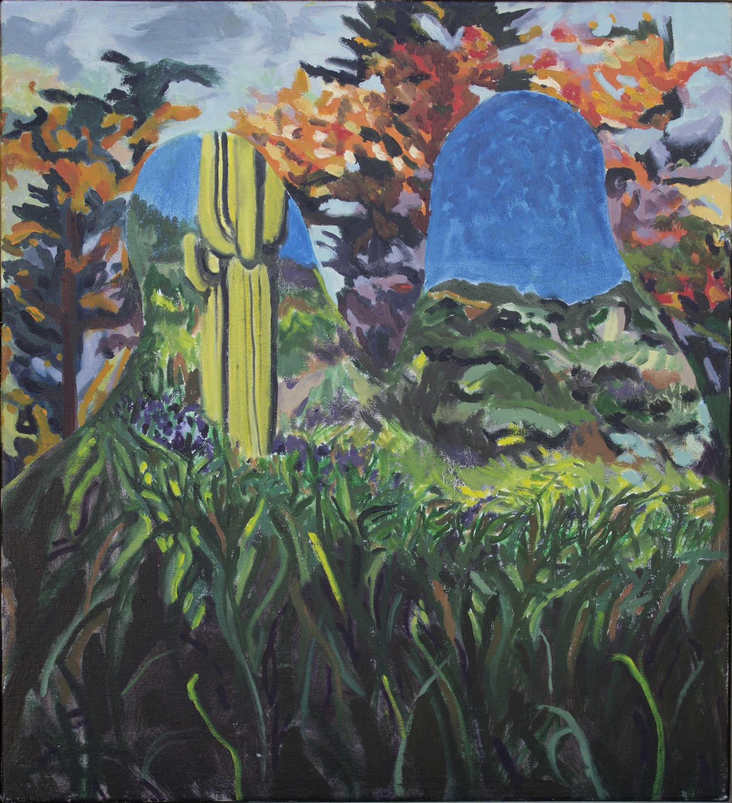 I create paintings in which one landscape is disrupted by the insertion of a disparate landscape into the same composition. By way of this juxtaposition, I seek to illustrate sensory experience as fractured, multiple, and simultaneous. I also paint figures with tenuous edges, whose relation to surrounding space represents the meeting of the individual with the world, and the way the two act on one another.