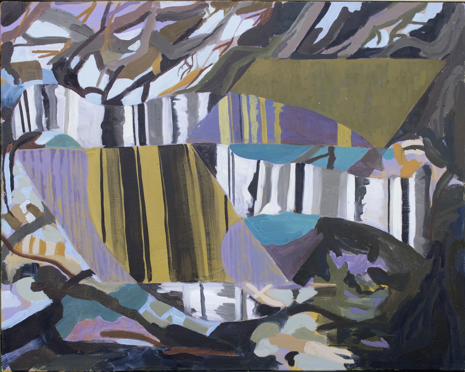 I attempt to complicate boundaries between objects and space, using the shared edges of forms as sites of visual destabilization. My goal is to enact, in paint, the tension between a unified plane of perception and its fractured parts. My hope is that my paintings may activate an awareness of the fragmented nature of our perception, and by extension, the way we conceive of and situate ourselves in time and space.